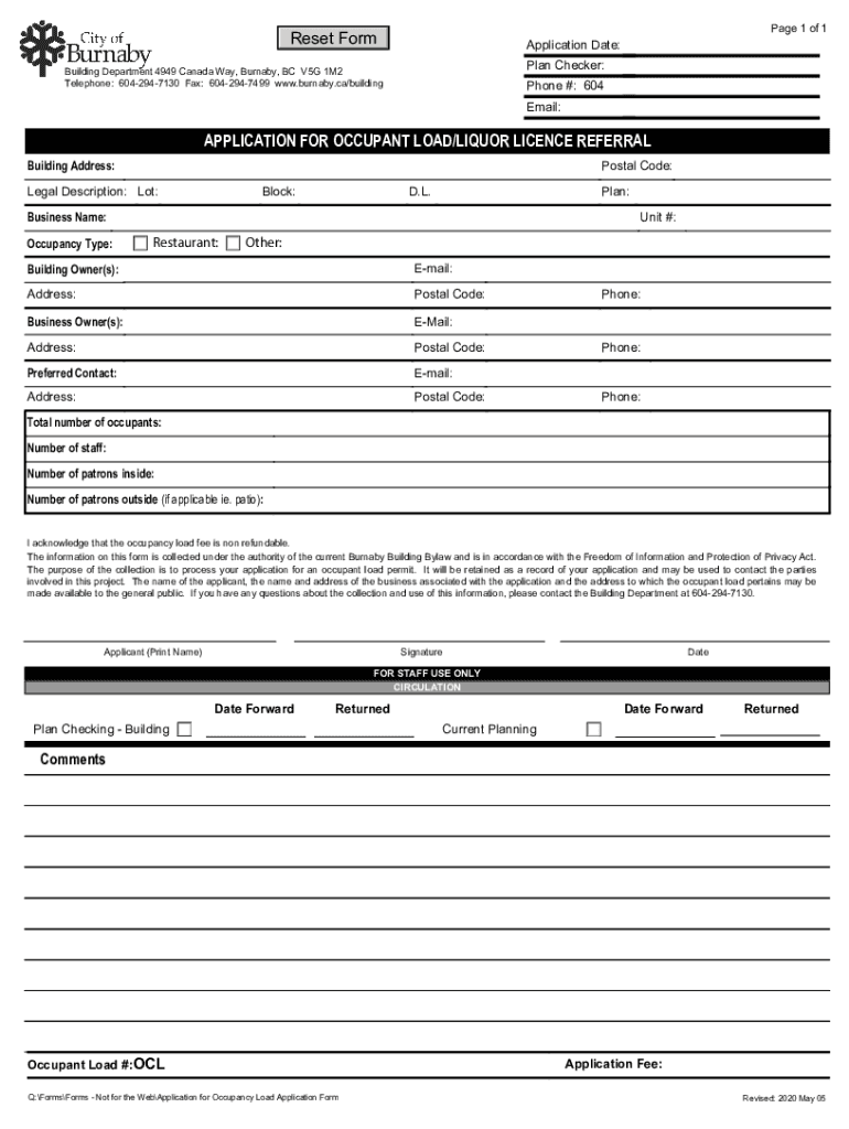 Page 1 of 1Reset Formalization Date: Plan Checker:Building Department 4949 Canada Way, Burnaby, BC V5G 1M2 Telephone: 6042947130 Fax: 6042947499 www.burnaby.ca/buildingPhone #: 604 Email:APPLICATION