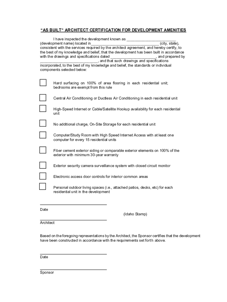 AS BUILT ARCHITECT CERTIFICATION FOR DEVELOPMENT AMENITIES I have inspected the development known as ___ (development name) located in___ (city, state), consistent with the services required by the