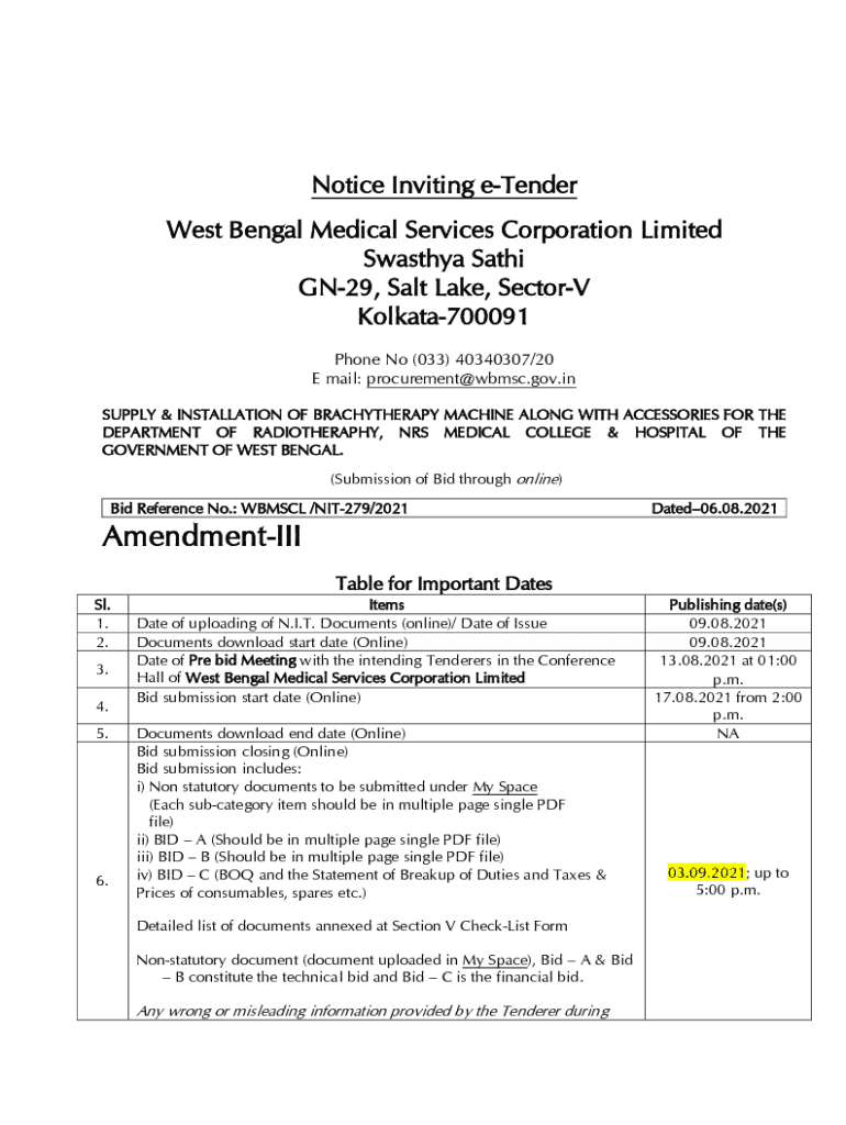 Notice Inviting tender West Bengal Medical Services Corporation Limited Swarthy Sat hi GN29, Salt Lake, Sector Kolkata700091 Phone No (033) 40340307/20 E mail: procurement@wbmsc.gov.in SUPPLY & INSTALLATION