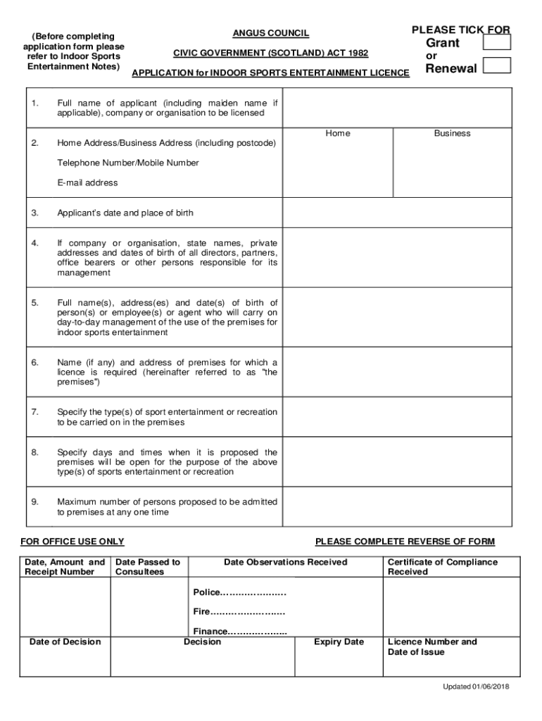 (Before completing application form please refer to Indoor Sports Entertainment Notes)PLEASE TICK ORANGES COUNCIL Grant CIVIC GOVERNMENT (SCOTLAND) ACT 1982orAPPLICATION for INDOOR SPORTS ENTERTAINMENT