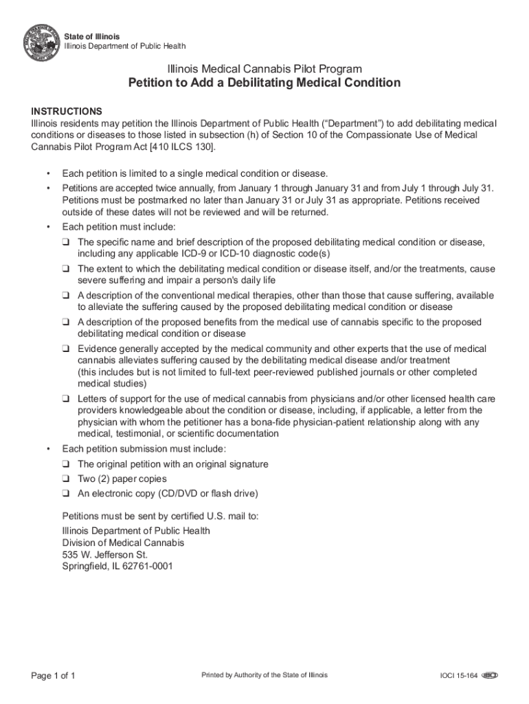 State of Illinois Department of Public Health Illinois Medical Cannabis Pilot ProgramPetition to Add a Debilitating Medical ConditionINSTRUCTIONS Illinois residents may petition the Illinois Department