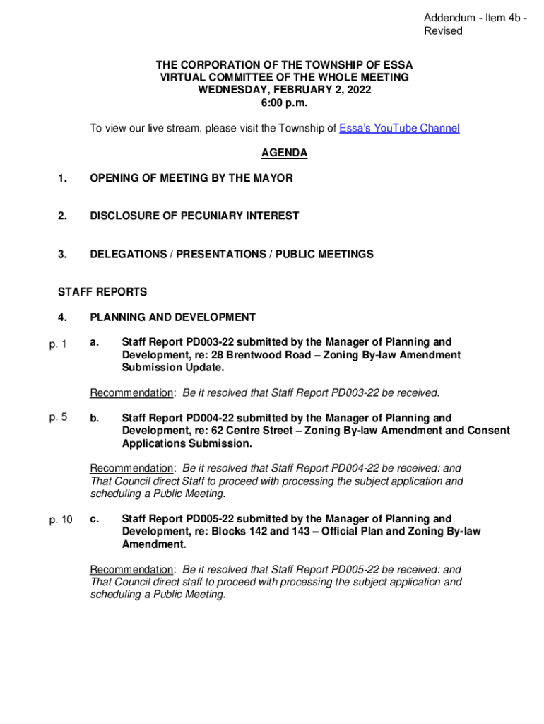 Addendum Item 4b Revised THE CORPORATION OF THE TOWNSHIP OF ESSAY VIRTUAL COMMITTEE OF THE WHOLE MEETING WEDNESDAY, FEBRUARY 2, 2022 6:00 p.m. To view our live stream, please visit the Township of