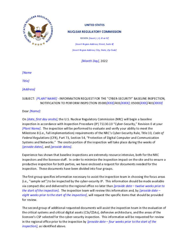 UNITED STATESNUCLEAR REGULATORY COMMISSION REGION [Insert; I, II, III or IV] [Insert Region Address; Street, Suite #] [Insert Region Address; City, State, Zip Code][Month Day], 2022 [Name Title] [Address]