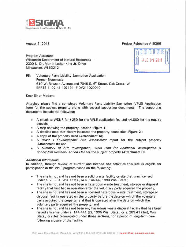 Project Reference #16366August 6, 2018ow ml ill program Assistant Wisconsin Department of Natural Resources AUG 0 7 20182300 N. Dr. Martin Luther King Jr. Drive Milwaukee, WI 53212ByVoluntary Party