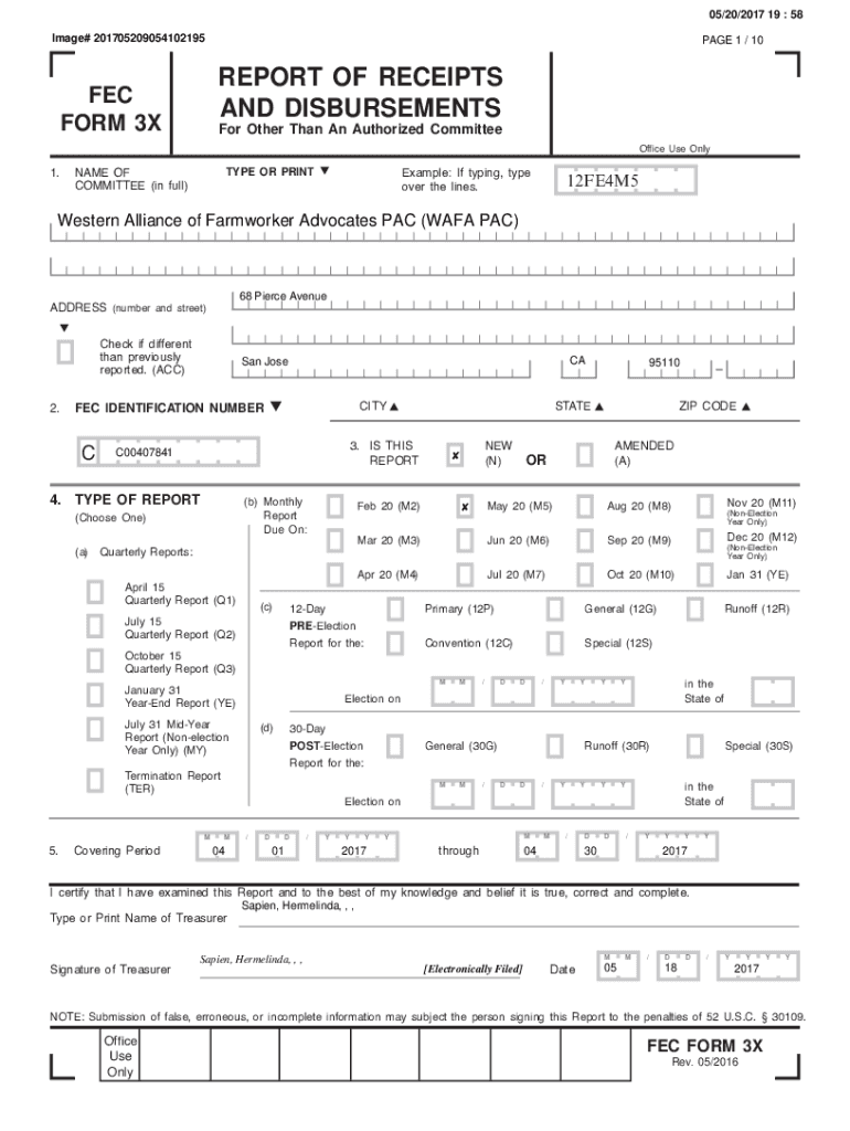 05/20/2017 19 : 58 Image# 201705209054102195PAGE 1 / 10REPORT OF RECEIPTS AND DISBURSEMENTS FEC FORM 3XFor Other Than An Authorized Committee Office Use Only1.NAME OF COMMITTEE (in full)Example:If