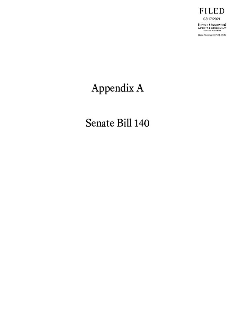 03/17/2021Case Number: OP 210125Appendix A Senate Bill 140CHAPTER #SENATE BILL NO. 140 INTRODUCED BY K. REGION, J. ELLSWORTH ACT GENERALLY REVISING LAWS RELATED TO CERTAIN JUDICIAL APPOINTMENTS; PROVIDING