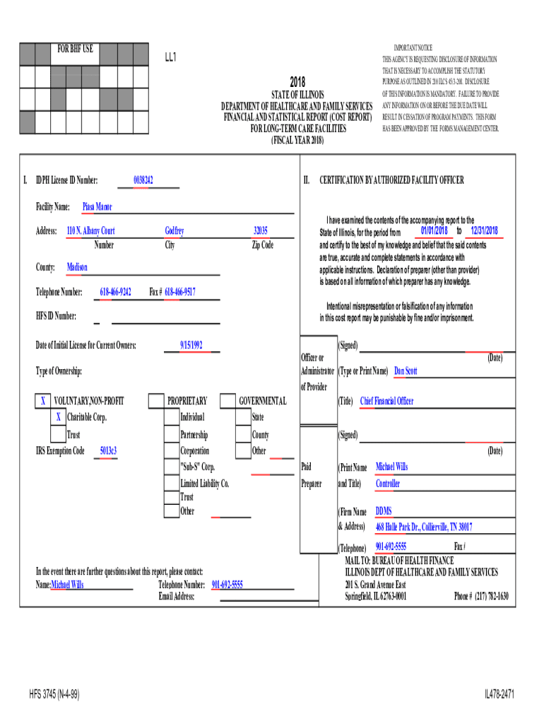 FOR BHF USELL1 2018STATE OF ILLINOIS DEPARTMENT OF HEALTHCARE AND FAMILY SERVICES FINANCIAL AND STATISTICAL REPORT (COST REPORT) FOR LONGER CARE FACILITIES (FISCAL YEAR 2018) I.DPH License ID Number: