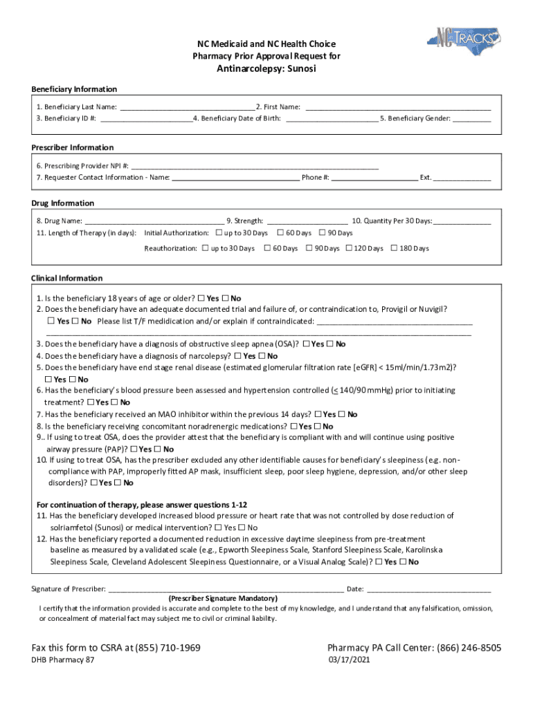 NC Medicaid and NC Health Choice Pharmacy Prior Approval Request forAntinarcolepsy: Suns Beneficiary Information 1. Beneficiary Last Name: ___ 2. First Name: ___ 3. Beneficiary ID #: ___4. Beneficiary