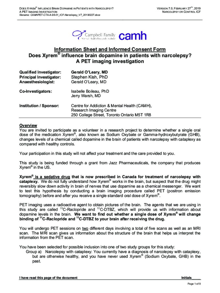 DOES XYLEM INFLUENCE BRAIN IN PATIENTS WITH NARCOLEPSY? A PET IMAGING INVESTIGATION filename: CAMHPETCTAA9801_Narcolepsy_V7_20190227.docxTHVERSION 7.0, FEBRUARY 27, 2019, NARCOLEPSY OR CONTROL Information