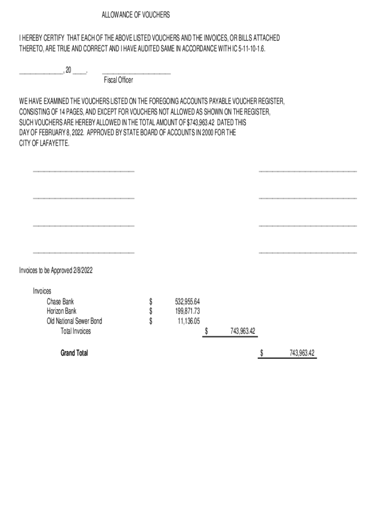 ALLOWANCE OF VOUCHERS I HEREBY CERTIFY THAT EACH OF THE ABOVE LISTED VOUCHERS AND THE INVOICES, OR BILLS ATTACHED THERETO, ARE TRUE AND CORRECT AND I HAVE AUDITED SAME IN ACCORDANCE WITH IC 511101.6.