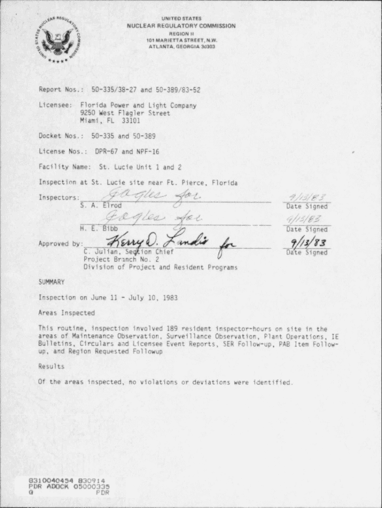 R.×UNITED STATES \'MO:q\'#, [. NUCLEAR REGULATORY Commission, REGION ll 101 MARIETTA STREET. N.W. ATLANTA, GEORGIA 30303ci\'$#...../Report Nos.: Licensee:50335/3827 and 50389/8352Florida Power and