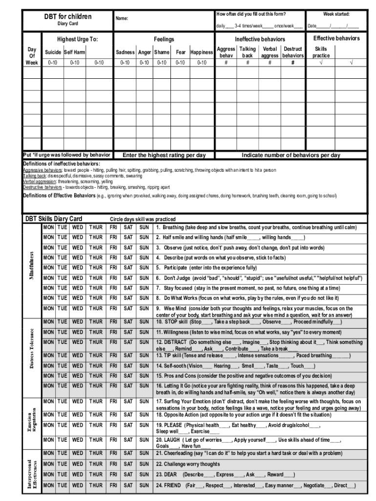 Get the free www.coursehero.comfile148549506Diary card.docx - DBT Program First Name Diary Card S...