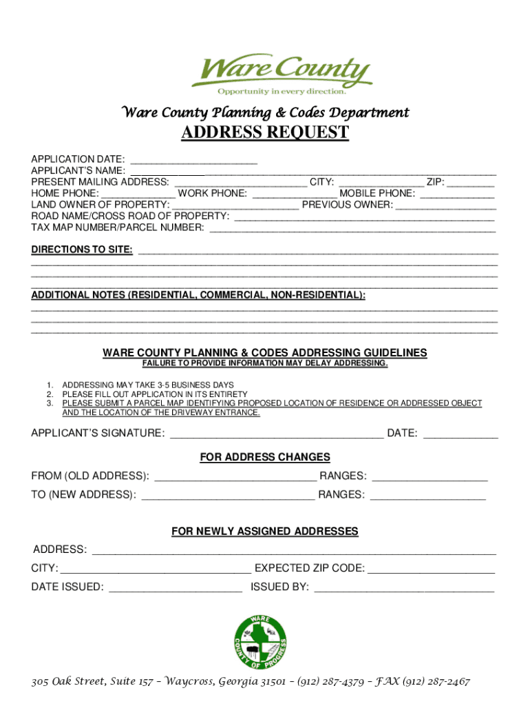 Ware County Planning & Codes DepartmentADDRESS REQUEST APPLICATION DATE: ___ APPLICANTS NAME: ___ PRESENT MAILING ADDRESS: ___ CITY: ___ ZIP: ___ HOME PHONE: ___ WORK PHONE: ___ MOBILE PHONE: ___