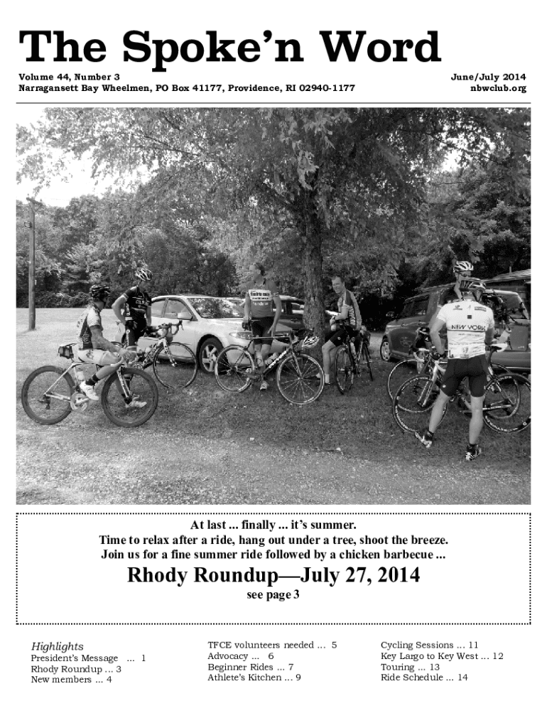 The Spoken Word Volume 44, Number 3 Narragansett Bay Wheelmen, PO Box 41177, Providence, RI 029401177June/July 2014 club. Organ last ... finally ... its summer. Time to relax after a ride, hang out