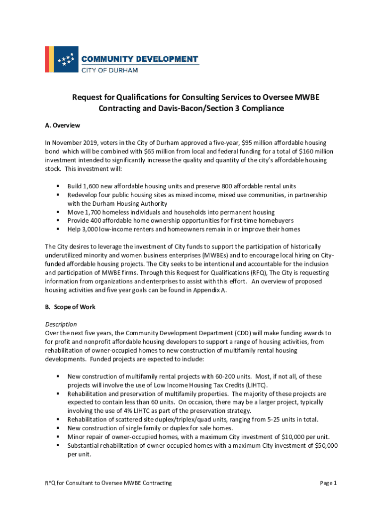 Request for Qualifications for Consulting Services to Oversee WE Contracting and Davis Bacon/Section 3 Compliance A. Overview In November 2019, voters in the City of Durham approved a five year, $95