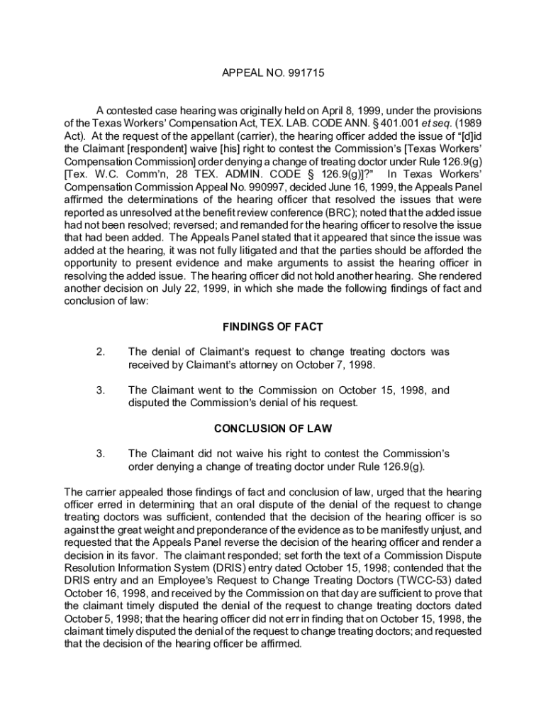 Get the free APPEAL NO. 991715 A contested case hearing was originally held ...