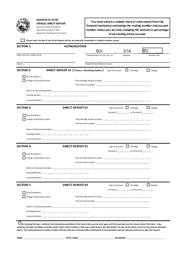 AUDITOR OF STATE PAYROLL DIRECT DEPOSIT State Form 43591 (R16/0422) Approved by Auditor of State Approved by State Board of Accounts must attach a voided check or a document from the financial institution