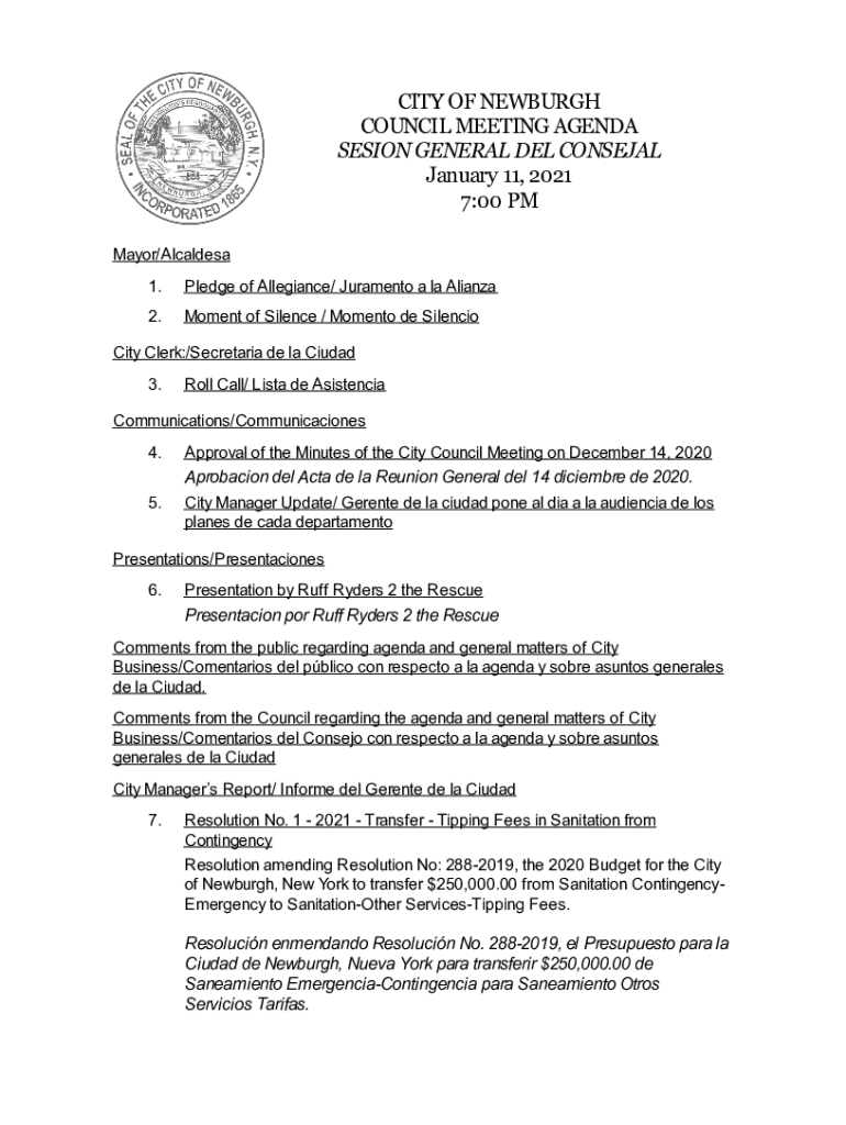 CITY OF NEWBURGH COUNCIL MEETING AGENDA SESSION GENERAL DEL CONCEAL January 11, 2021 7:00 PM Mayor/Arcades 1. Pledge of Allegiance/ Judgment à la Alianza2. Moment of Silence / Moment ode SilencioCity