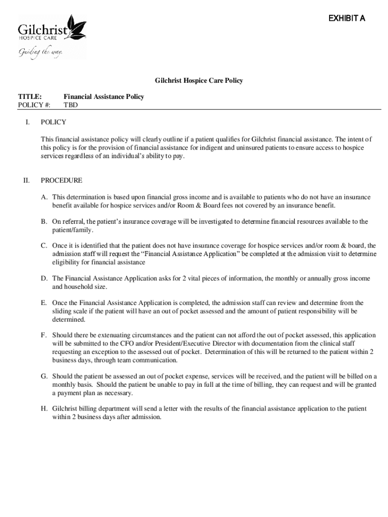 EXHIBIT Gilchrist Hospice Care Policy TITLE: POLICY #: I. Financial Assistance Policy This financial assistance policy will clearly outline if a patient qualifies for Gilchrist financial assistance.
