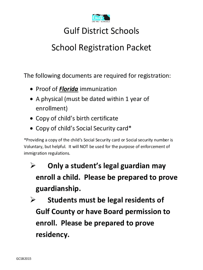 GulfDistrictSchools SchoolRegistrationPacket Thefollowingdocumentsarerequiredforregistration: ProofofFloridaimmunization Physical(mustbedatedwithin1yearof enrollment) Copyofchildsbirthcertificate