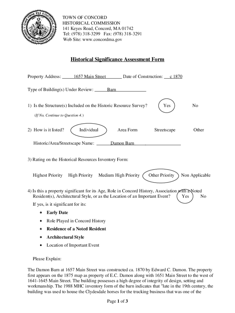 TOWN OF CONCORD HISTORICAL COMMISSION 141 Eyes Road, Concord, MA 01742 Tel: (978) 3183299 Fax: (978) 3183291 Website: www.concordma.govHistorical Significance Assessment Form Property Address:1657