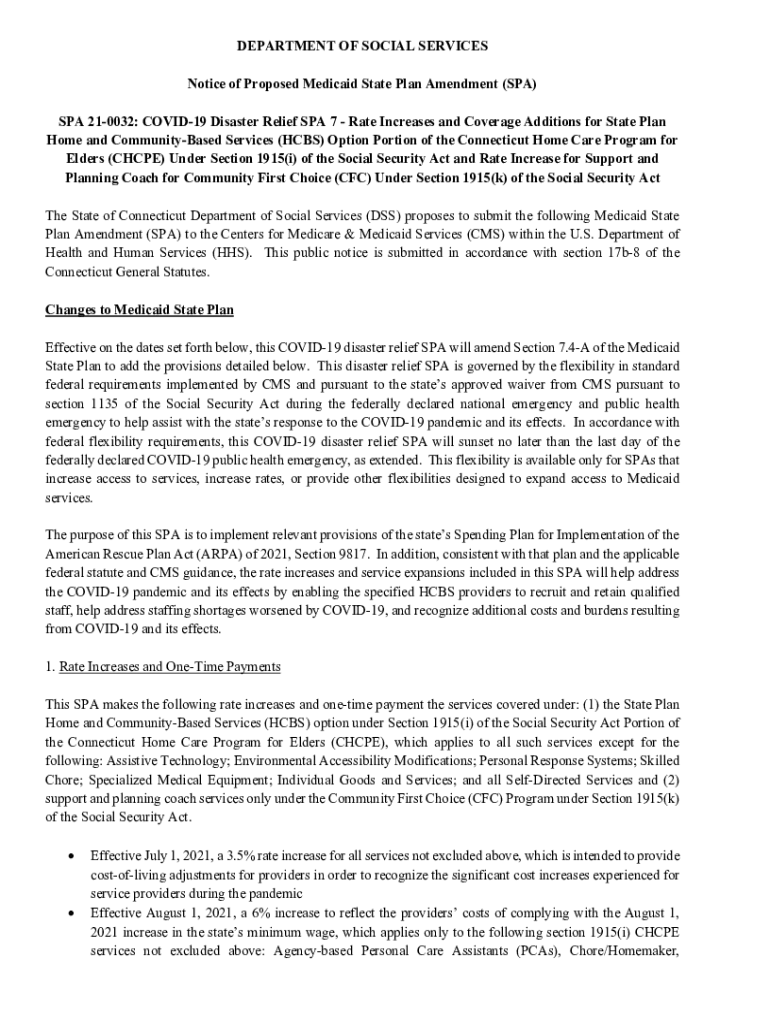 DEPARTMENT OF SOCIAL SERVICES Notice of Proposed Medicaid State Plan Amendment (SPA) SPA 210032: COVID-19 Disaster Relief SPA 7 Rate Increases and Coverage Additions for State Plan Home and CommunityBased