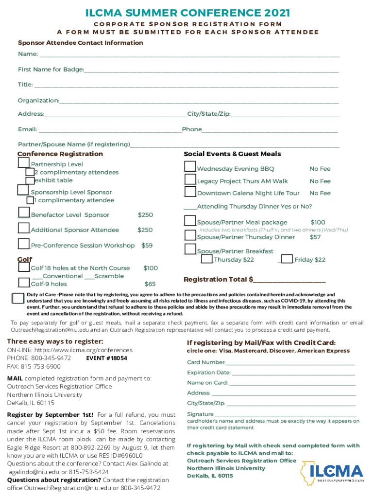 IL CMA SUMMER CONFERENCE 2021 CORPORATE SPONSOR REGISTRATION From A FORM MUST BE SUBMITTED FOR EACH SPONSOR ATTENDEE Contact Information Name: ___ First Name for Badge:___ Title: ___ Organization:___
