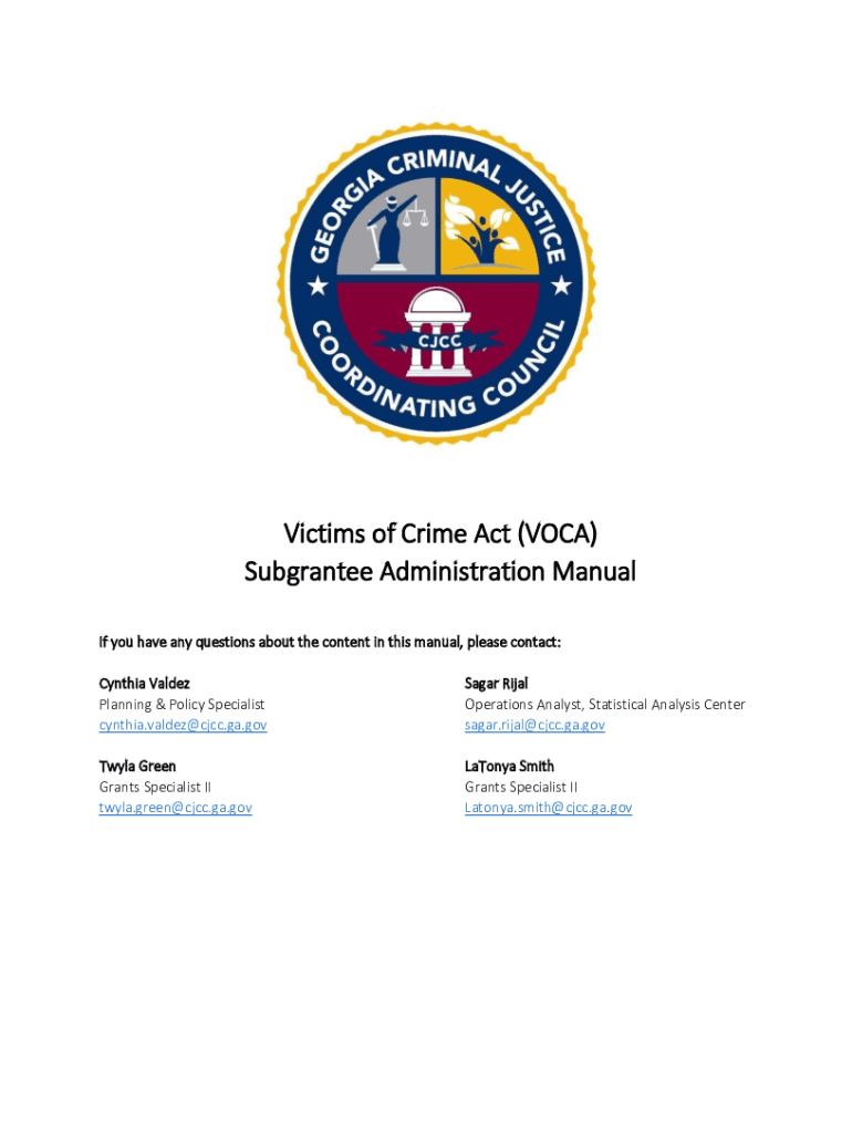 Victims of Crime Act (VOCAL) Subgrantee Administration Manual If you have any questions about the content in this manual, please contact: Cynthia Valdez Planning & Policy Specialist cynthia.valdez@cjcc.ga.govSagar