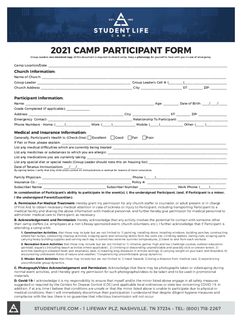 2021 Middle School and High School Camp Dear Parents, Summer Camp 2021 is Monday, July 12Friday, July 16, at Student Life Camp at Winder mere Conference Center, Lake of the Ozarks, Missouri. Registration
