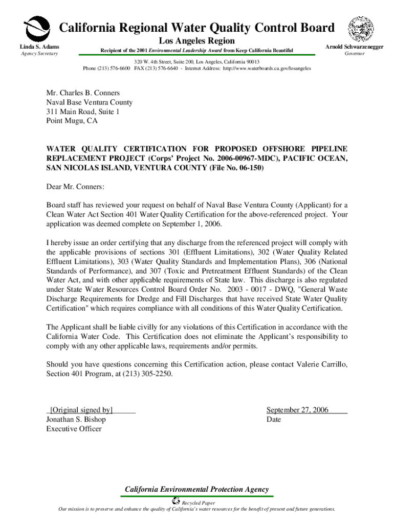 California Regional Water Quality Control Board Linda S. Adams Agency Secretary Los Angeles Region Recipient of the 2001 Environmental Leadership Award from Keep California Beautiful Arnold Schwarzenegger