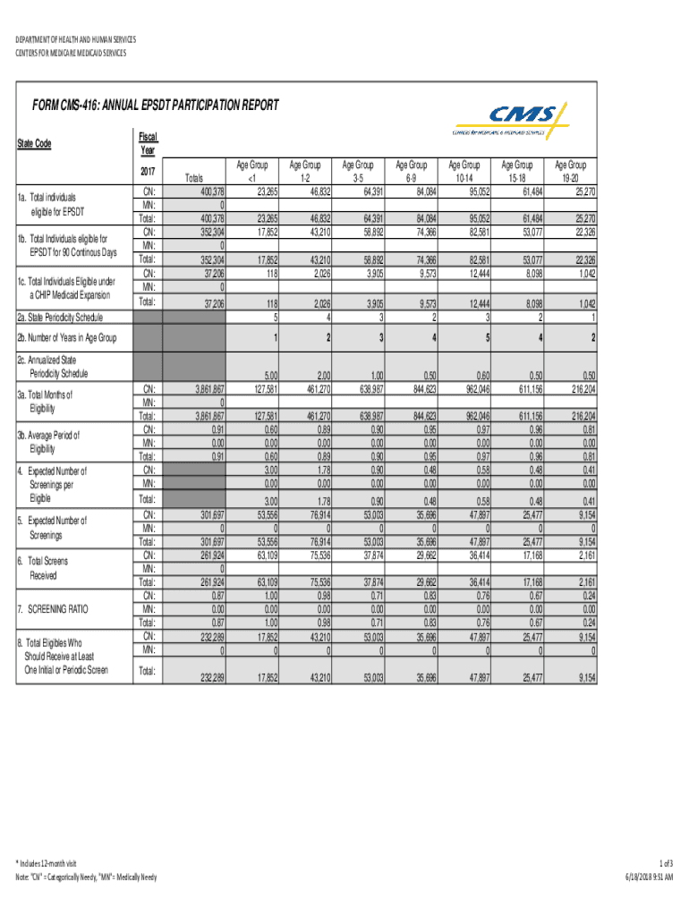DEPARTMENT OF HEALTH AND HUMAN SERVICES CENTERS FOR MEDICARE MEDICAID SERVICESFORM CMS416: ANNUAL EPS DT PARTICIPATION REPORT State CodeFiscal Year 20171a. Total individuals eligible for EPS DT 1b.
