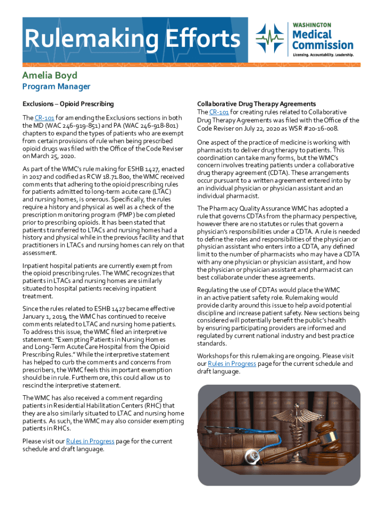 Rule making Efforts Amelia BoydProgram Manager Exclusions Opioid Prescribing The CR101 for amending the Exclusions sections in both the MD (WAC 246919851) and PA (WAC 246918801) chapters to expand