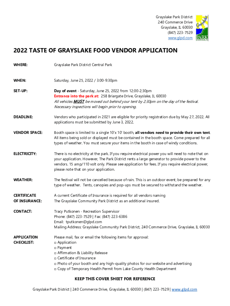 Grayslake Park District 240 Commerce Drive Grayslake, IL 60030 (847) 2237529 www.glpd.com2022 TASTE OF GRAYSLAKE FOOD VENDOR APPLICATION WHERE:Grayslake Park District Central Parker:Saturday, June