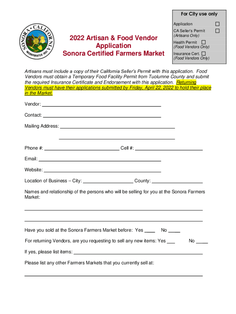 For City use only Application2022 Artisan & Food Vendor Application Sonora Certified Farmers Market CA Sellers Permit (Artisans Only) Health Permit (Food Vendors Only) Insurance Cert. (Food Vendors