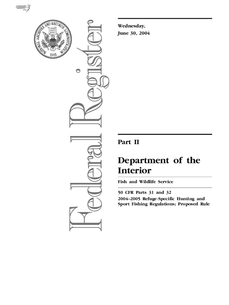 Wednesday, June 30, 2004Part Department of the Interior Fish and Wildlife Service 50 CFR Parts 31 and 32 20042005 RefugeSpecific Hunting and Sport Fishing Regulations; Proposed RuleVerDate May21200418:26