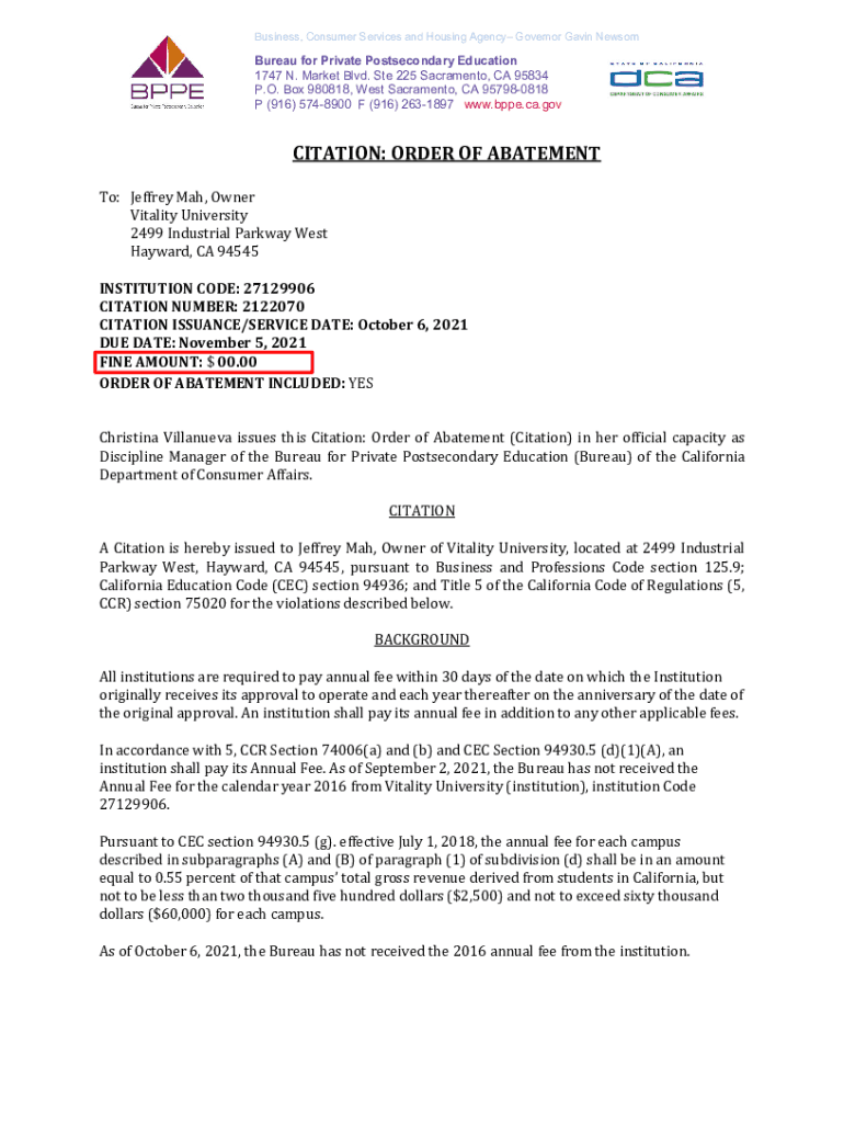 Get the free Bureau for Private Postsecondary Education - Vitality University - Citation. Bureau ...