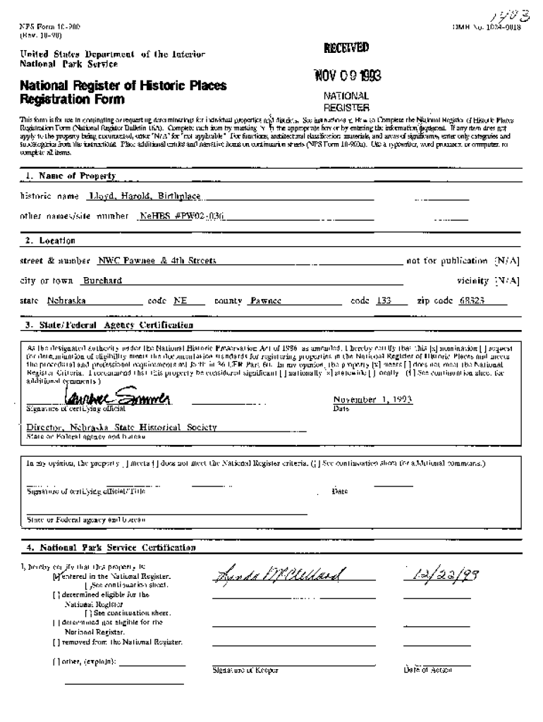 NFS Form 10900 (Rev. 1090)OMB No. 10240018RECEIVEDUnited States Department of the Interior National Park ServiceNational Register of Historic Places Registration Form 91993 NATIONAL Registers form