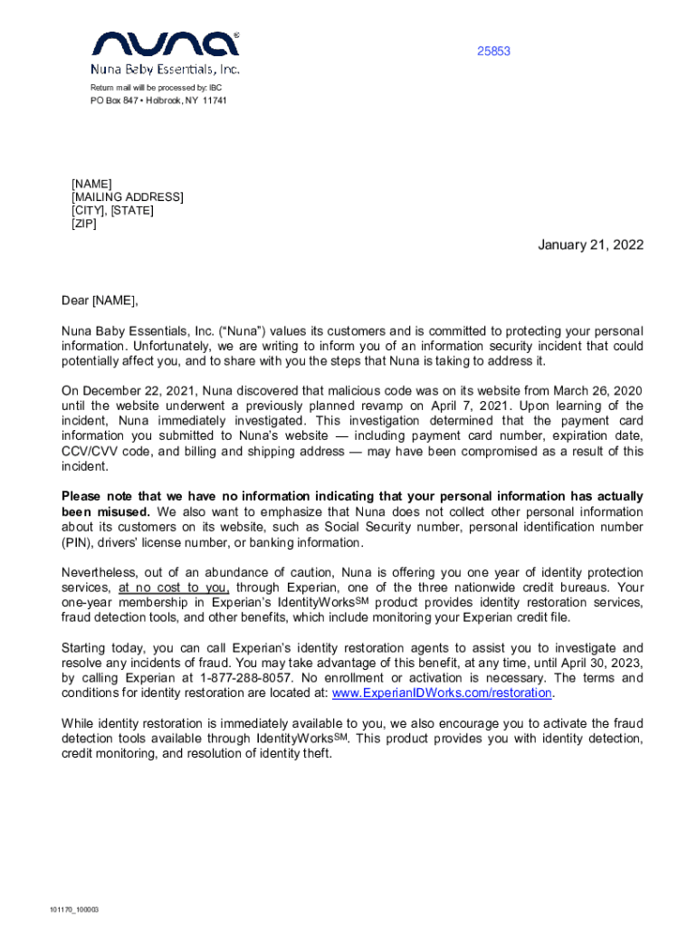 25853 Return mail will be processed by: IBC PO Box 847 Holbrook, NY 11741[NAME] [MAILING ADDRESS] [CITY], [STATE] [ZIP]January 21, 2022Dear [NAME], Nun Baby Essentials, Inc. (Nun) values its customers
