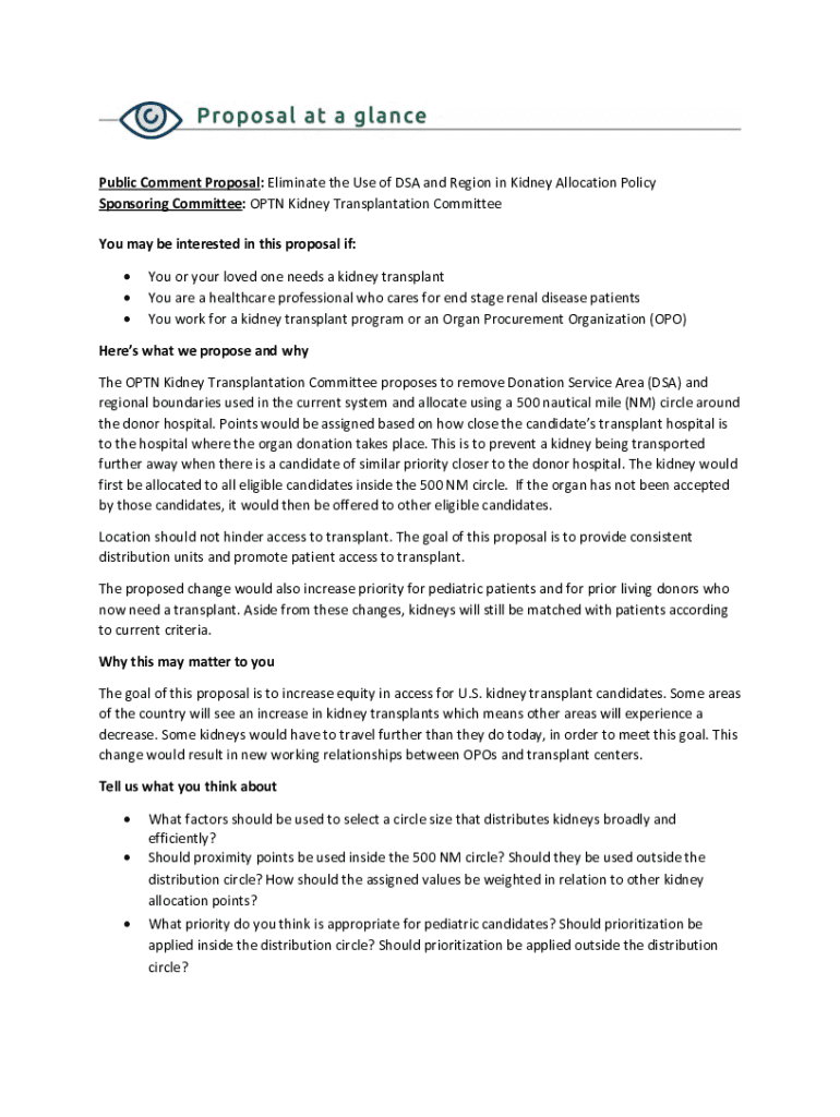 Public Comment Proposal: Eliminate the Use of DSA and Region in Kidney Allocation Policy Sponsoring Committee: OPEN Kidney Transplantation Committee You may be interested in this proposal if: You