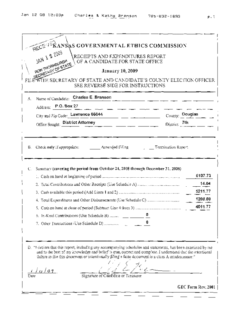 Jan 12 09 12:03pCharles &KathBranson7858321893p. 1., /?:;Indians. \'11.jS RECEIPTS AND EXPENDITURES REPORT 0G \'Co\', OF A CANDIDATE FOR STATE OFFICE’S GOVERNMENTAL Ethics COMMISSION\' $\'P, January