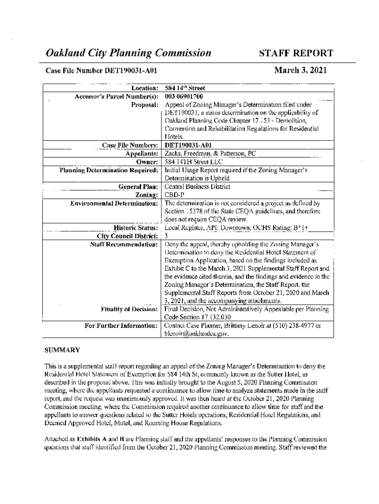 ATTACHMENT Planning Staff Responses to Planning Commission Questions Regarding 584 14th Street Residential Hotel Statement of Exemption Appeal Question 1: How was the building located at 584 14th