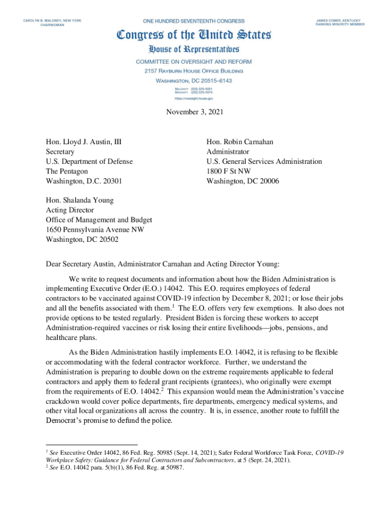 November 3, 2021Hon. Lloyd J. Austin, III Secretary U.S. Department of Defense The Pentagon Washington, D.C. 20301Hon. Robin Caravan Administrator U.S. General Services Administration 1800 F St NW