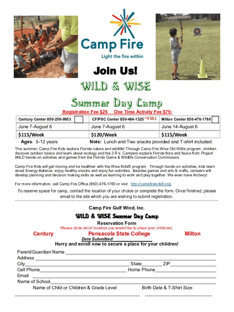 Join Us!WILD & WISE Summer Day CampRegistration Fee $25One Time Activity Fee $75:Century Center 8502560953CF/PSC Center 8504841525 **FULL Milton Center 8504761760June 7August 6June 7August 6June 14August
