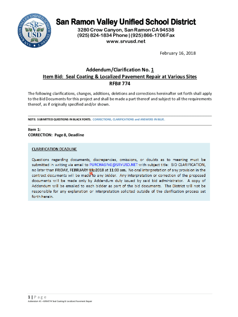 San Ramon Valley Unified School District 3280 Crow Canyon, San Ramon CA 94538 (925) 8241834 Phone | (925) 8661706 Fax www.srvusd.net February 16, 2018Addendum/Clarification No. 1 Item Bid: Seal Coating
