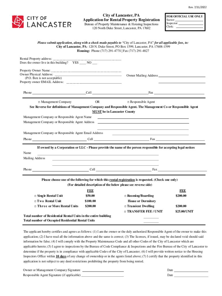 Rev. 7/11/2022City of Lancaster, PA Application for Rental Property Registration Bureau of Property Maintenance & Housing Inspections 120 North Duke Street, Lancaster, PA 17602FOR OFFICIAL USE ONLY