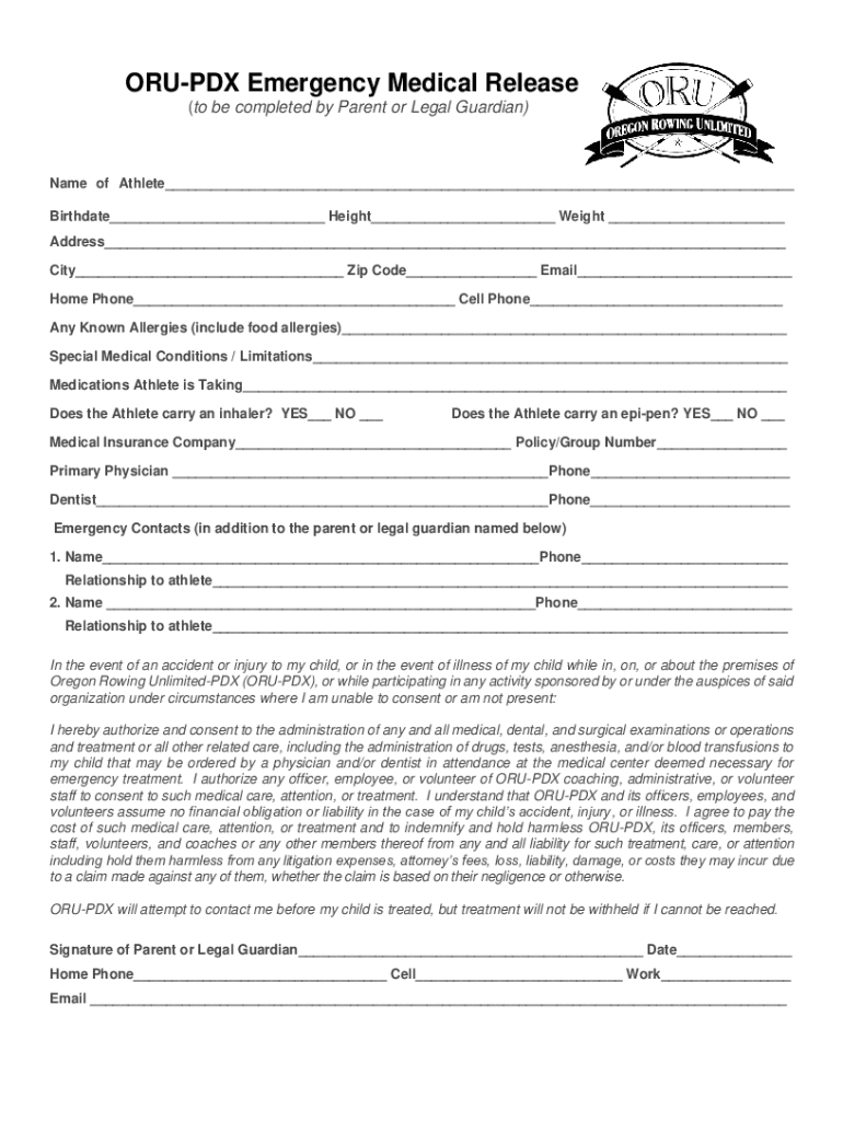 CRUDE Emergency Medical Release (to be completed by Parent or Legal Guardian)Name of Athlete___ Birthdate___ Height___ Weight ___ Address___ City___ Zip Code___ Email___ Home Phone___ Cell Phone___