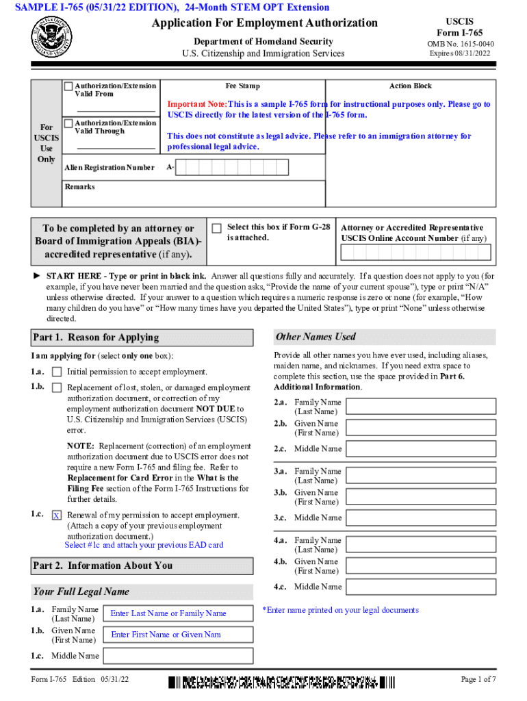 SAMPLE I765 (05/31/22 EDITION), 24Month STEM OPT ExtensionApplication For Employment AuthorizationUSCIS Form I765Department of Homeland Security U.S. Citizenship and Immigration Services Authorization/Extension
