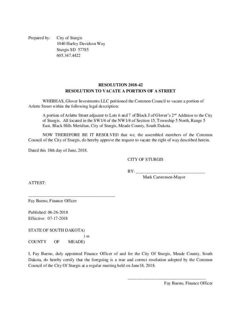 Prepared by:City of Surges 1040 Harley-Davidson Way Surges SD 57785 605.347.4422RESOLUTION 201842 RESOLUTION TO VACATE A PORTION OF A STREET WHEREAS, Glover Investments LLC petitioned the Common Council