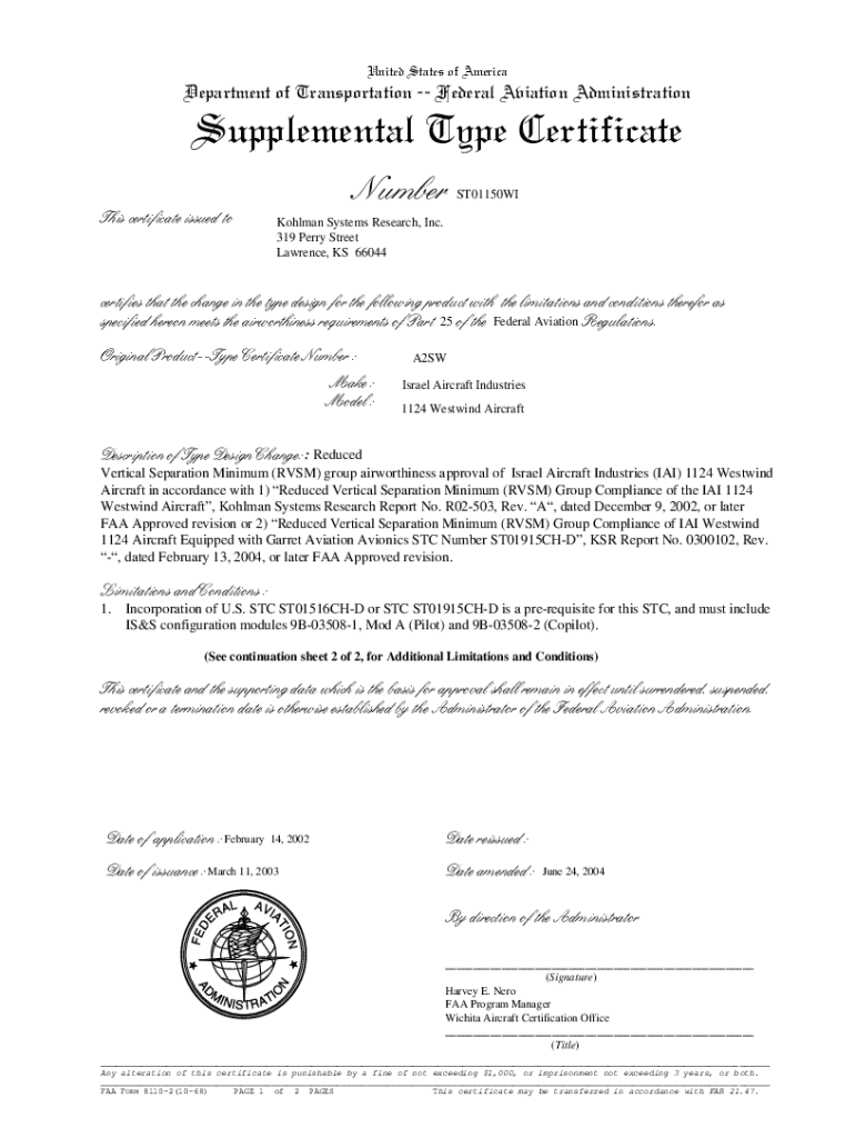 United States of AmericaDepartment of Transportation Federal Aviation AdministrationSupplemental Type Certificate Number This certificate issued toST01150WIKohlman Systems Research, Inc. 319 Perry