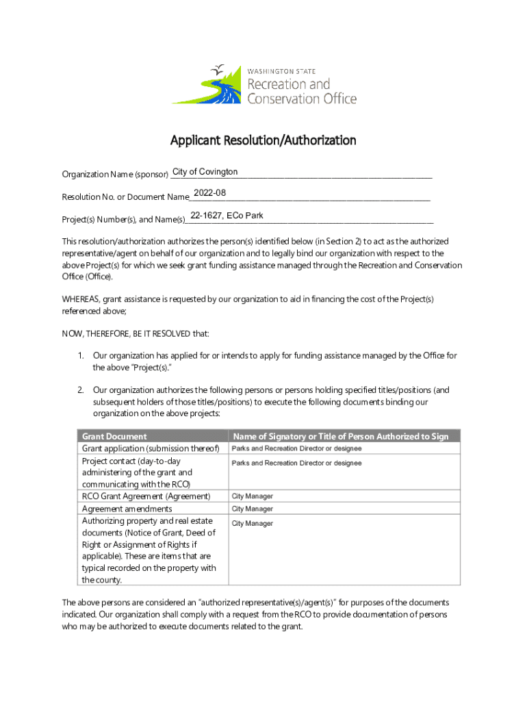 Applicant Resolution/Authorization City of Covington Organization Name (sponsor) ___ 202208 Resolution No. or Document Name___ 221627, ECo Park Project(s) Number(s), and Name(s)___ This resolution/authorization